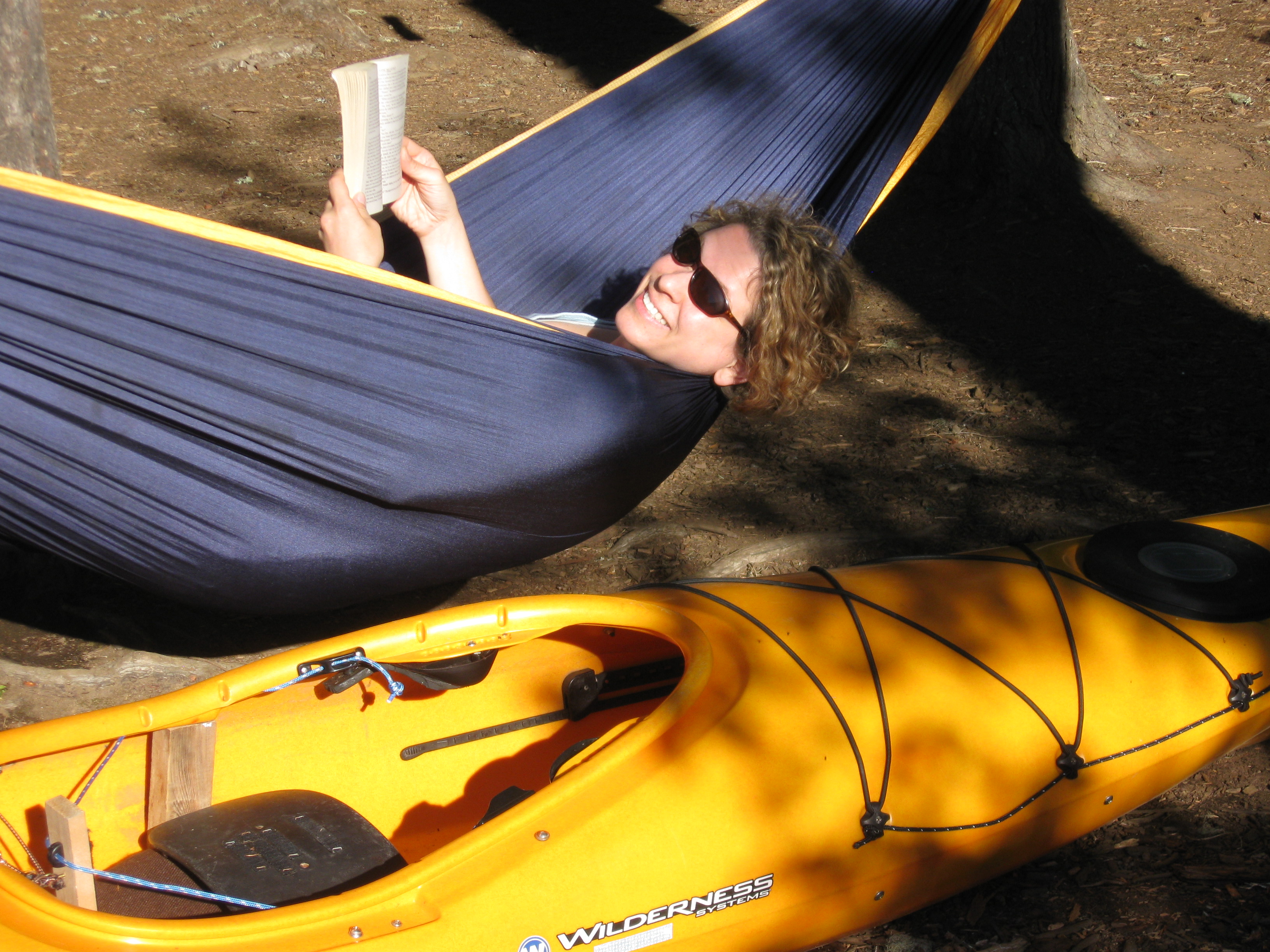 Stacy made herself home in the hammock. I found the lake pleasantly warm and took time to practice kayak rolling.