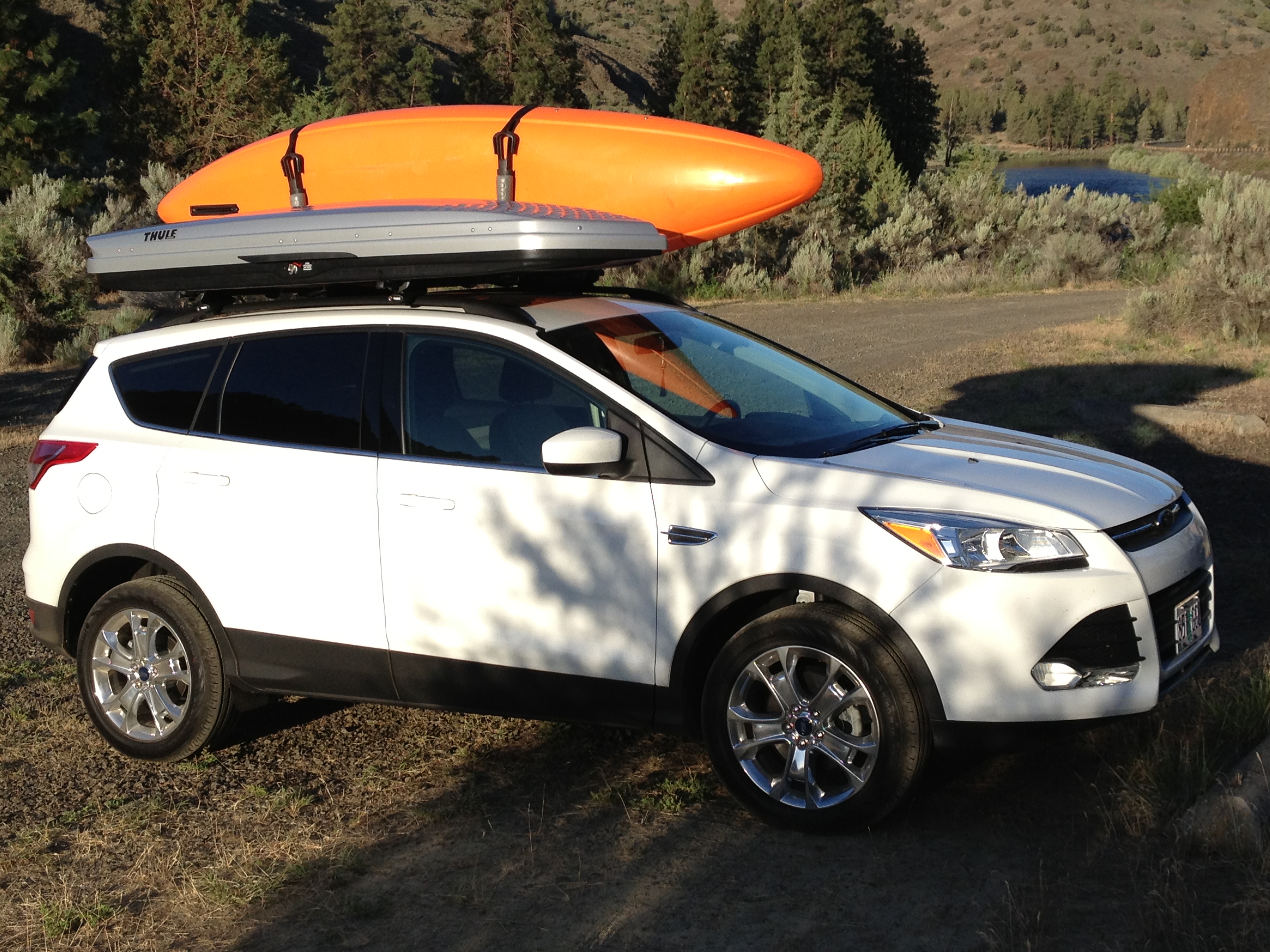 We packed up my new 2013 Ford Escape with Jackson Kayaks Rogue 9 and Rogue 10 kayaks. These kayaks are perfect for this trip, because they are good for the whitewater stretches, but also have a rear hatch – good for storing gear and food – and a skeg for the flat sections so they can be paddled straight.