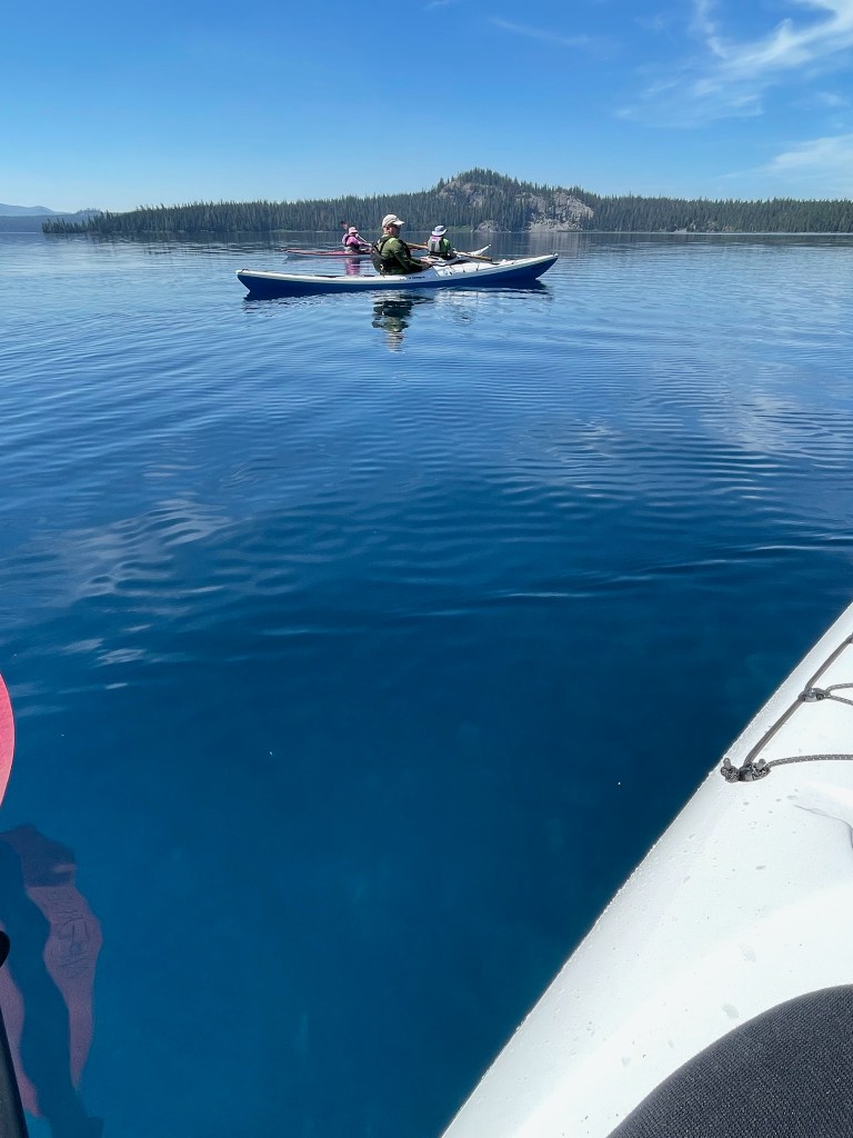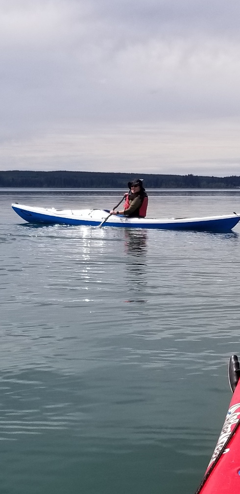 We came to a sand spit across the way, and spotted a colony of maybe 35 seals. They were all laid up on the beach soaking up the sun. But they were wary and all stared at us as we approached. I paddled slowly, mostly gliding toward them. Then, one by one, they moved into the water. Eventually the whole colony was swimming around looking at us. Sometimes, I could see a seal swimming under my kayak! They’d swim upside down so they could see my kayak above.