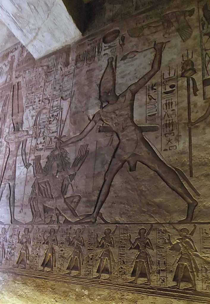 Throughout Egypt, these scenes of the many deities are common, and they’re often associated with after-life rituals. Ancient Egyptians spent their entire lives believing that this life was nothing more than a temporary state on the way to the next world. And to make that transition, they needed to adhere to the lifestyle dictated by Maat. Maat was both a goddess, and a set of principles to live by. This seemed to pervade ancient Egyptian art, which for the most part doesn’t stray out of the bounds of standards set by the priests. However, there are a few times I glimpsed examples of illustrations by artists actually showing emotion, such as terror. Or action – and that was the case at Abu Simbel.