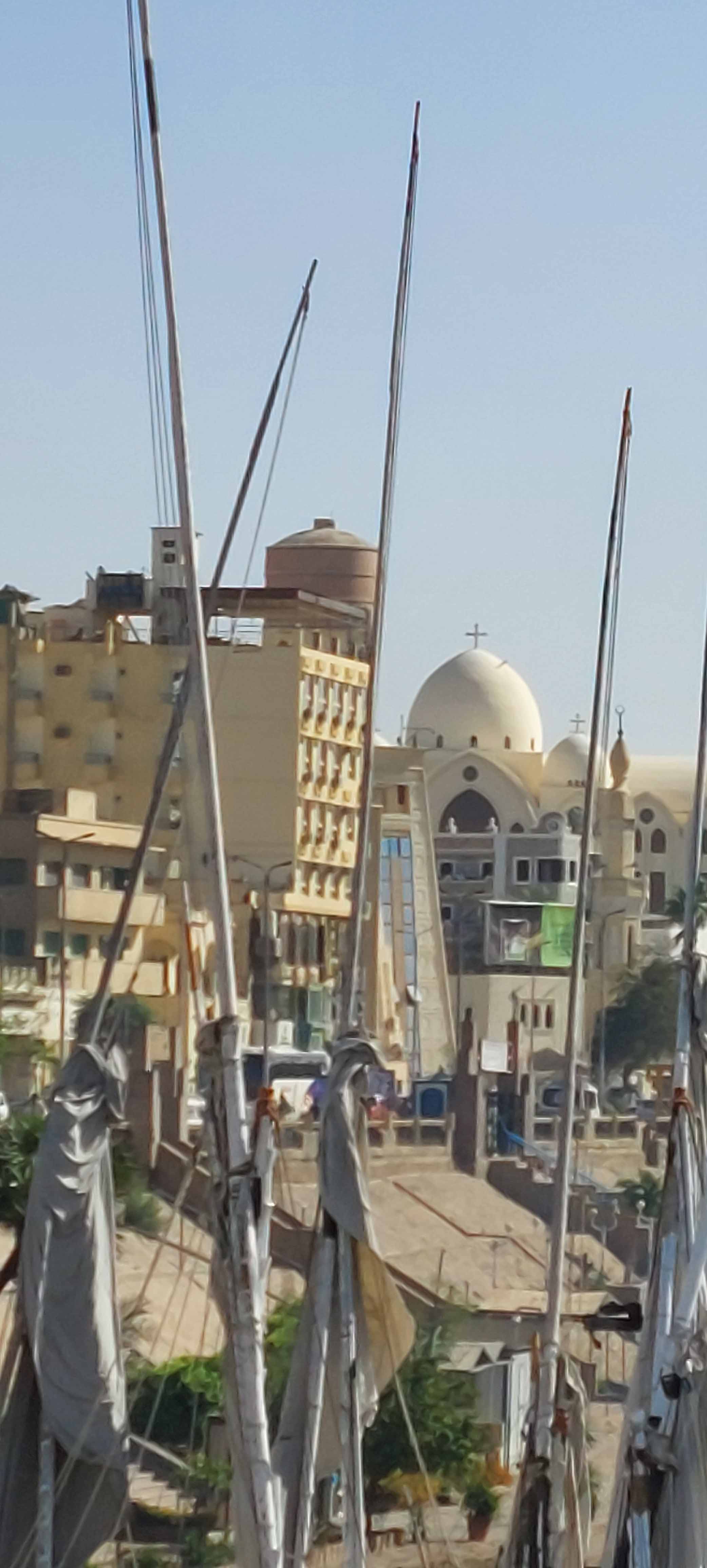 Up on deck, the views were ever changing. Sometimes looking down upon the neighboring boat, which might have a sphinx on its bow. Or, looking past the docks to a Coptic Christian cathedral.