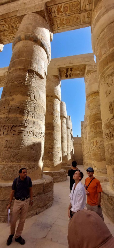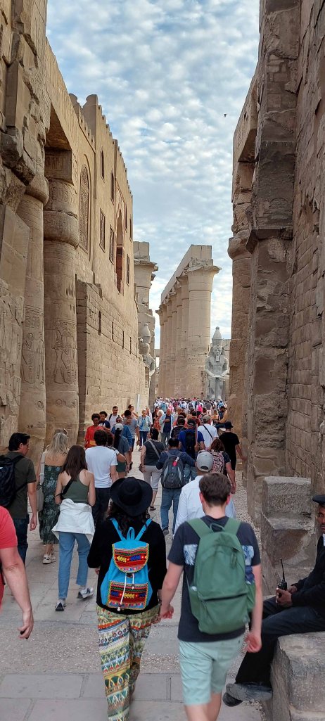 Our guide Ahmed encouraged us to get some pool time in during the hottest part of the day and then head to Luxor temple for the sunset. WOW was this a perfect choice. Luxor is said to be a location where pharaohs were crowned. Alexander the Great said he was crowned here. A number of them contributed to its construction. Amenhotep III, Ramses II, Horemheb, Queen Hatshepsut, and Tutankhamen all are represented.