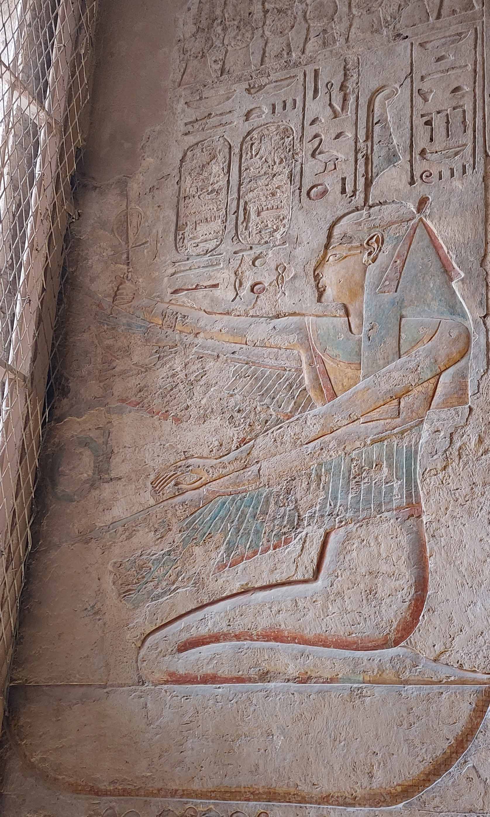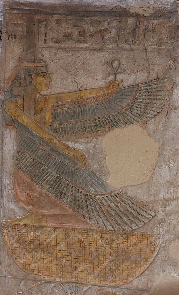 Inside the tomb, images of Ma’at guard its entrance and appear many times over. There is a scene of Ma’at with a harpist, and one of her with the sun god Ra.