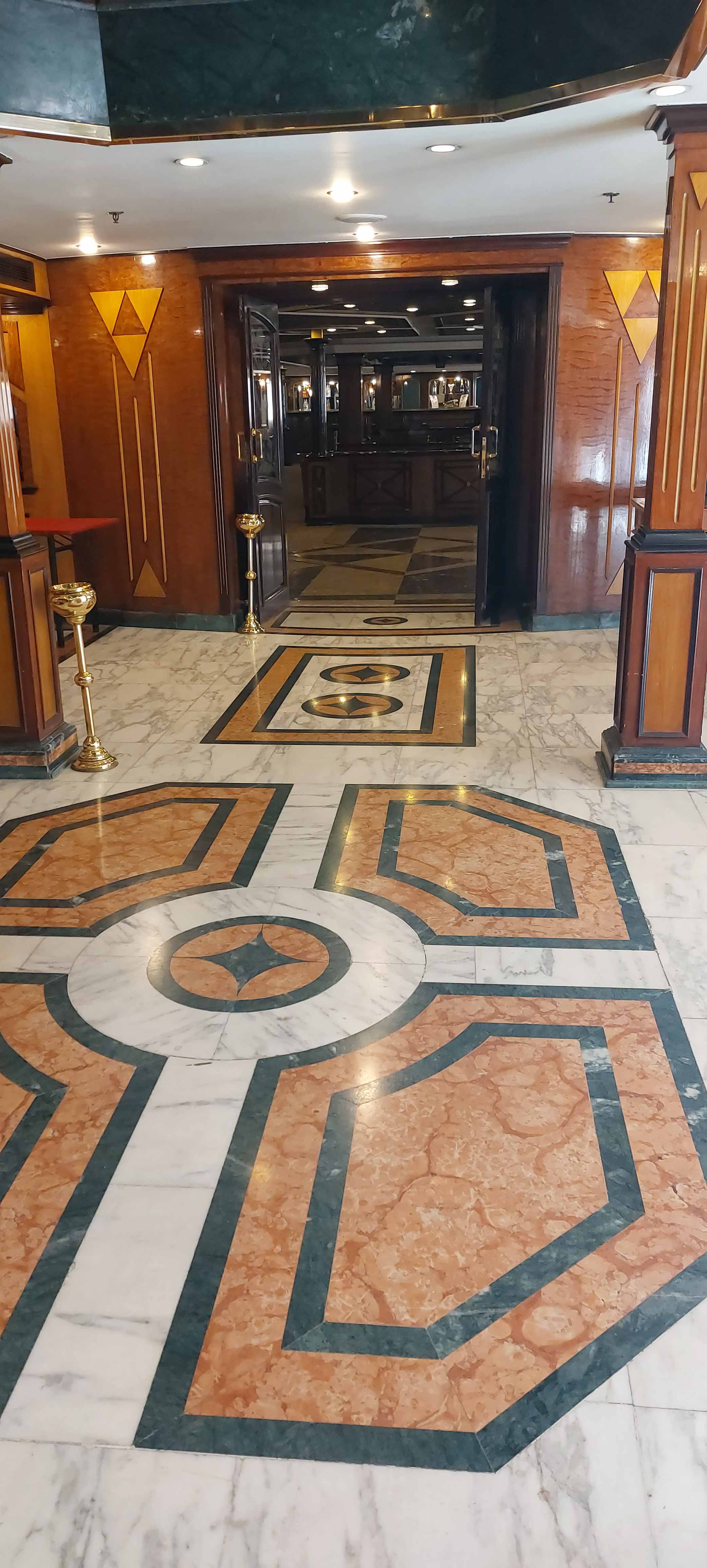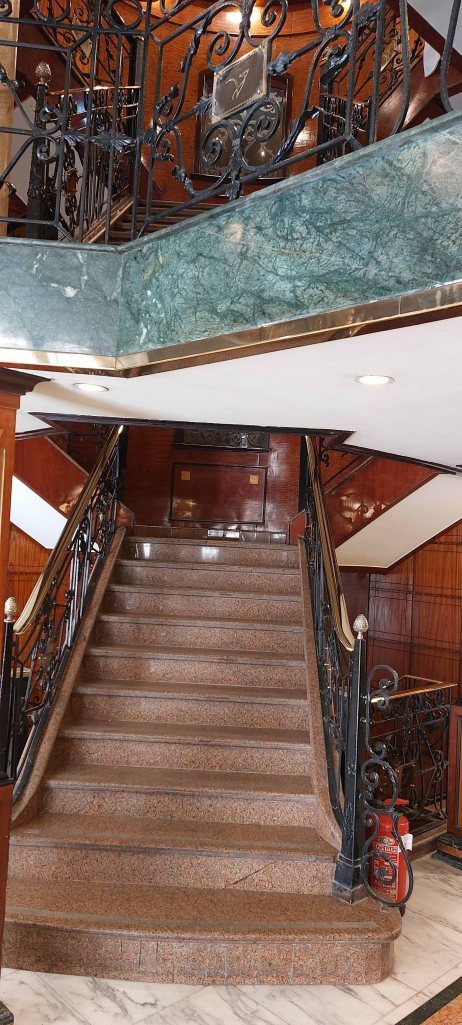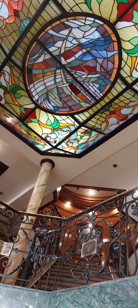 The ship had four decks, including the rooftop deck with bar and swimming pool. On the river level, there was another bar and the restaurant. All our on board meals were included. The food was good! The lobby area was grand. Polished granite everywhere, spiral staircase, and a stained glass overhead light.