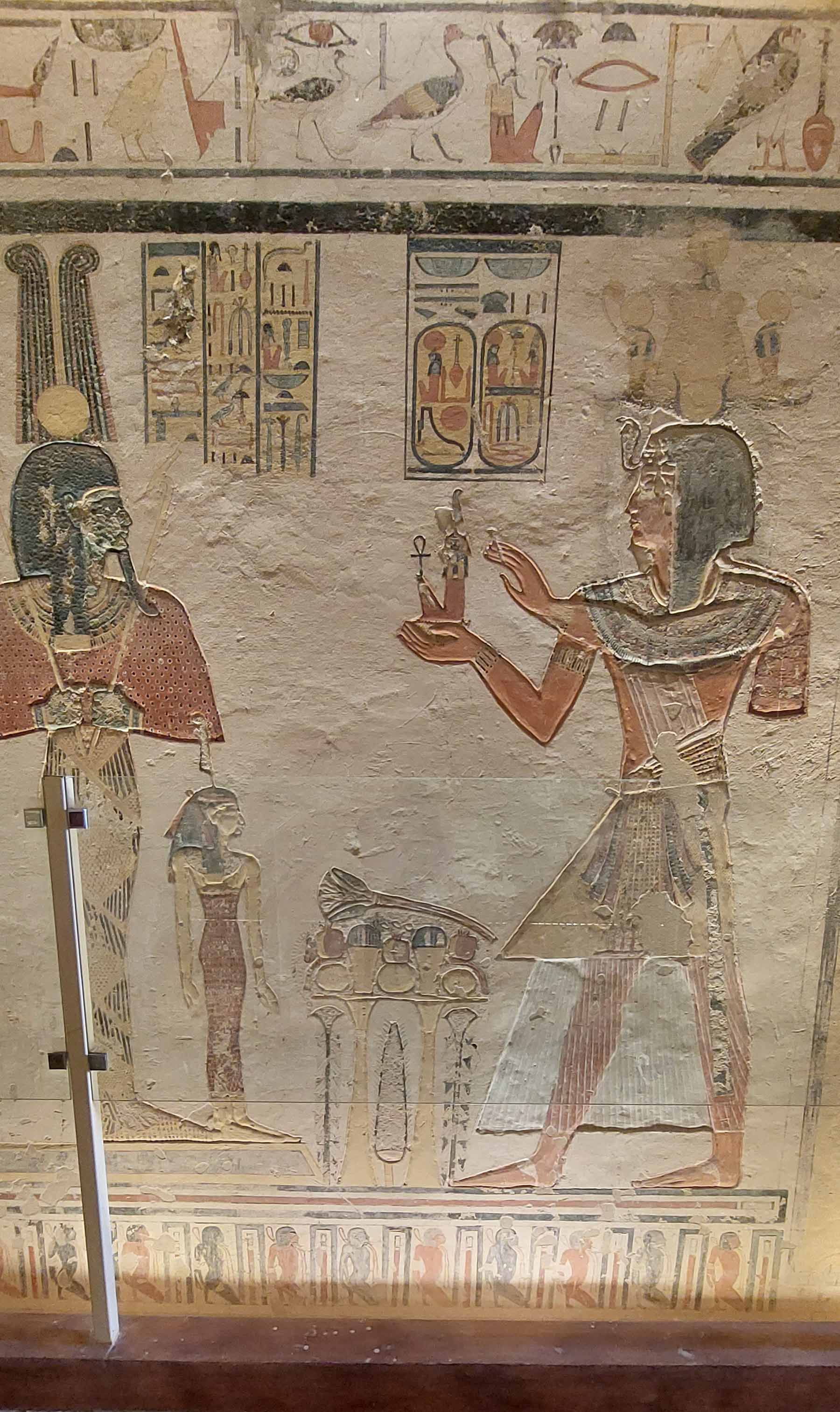 Upon awakening after death, prior to journeying the duat, the soul might not know its identity. To help out, Egyptians decorated the tomb walls with scenes from its Earthly life. We visited the tomb of Ramses IX. This image is such a scene of his life. When pharaohs were crowned, they presented an image of Ma’at to the highest god Amun – assuring him that the pharoah would ensure balance and harmony.