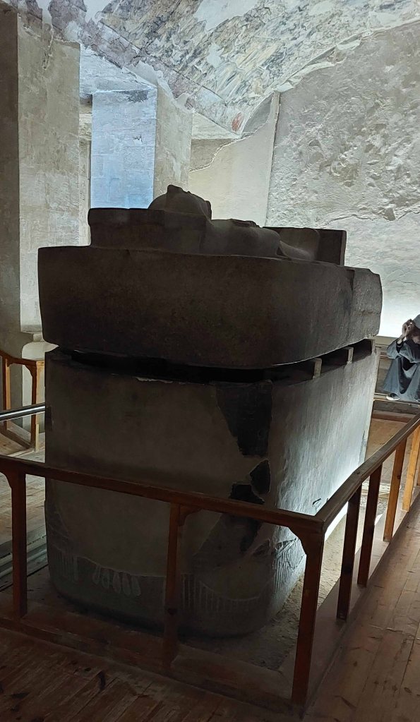 We are now in the chamber where the sarcophagus is located. Along the walls are more scenes from the journey through the Duat. We see the soul being challenged by serpents. We see the representation of the journey through out the night. The goddess Nut covers the ceiling from one side to the other. She oversees the stars. Beneath her elongated body are more scenes from challenges the soul faces on its way.