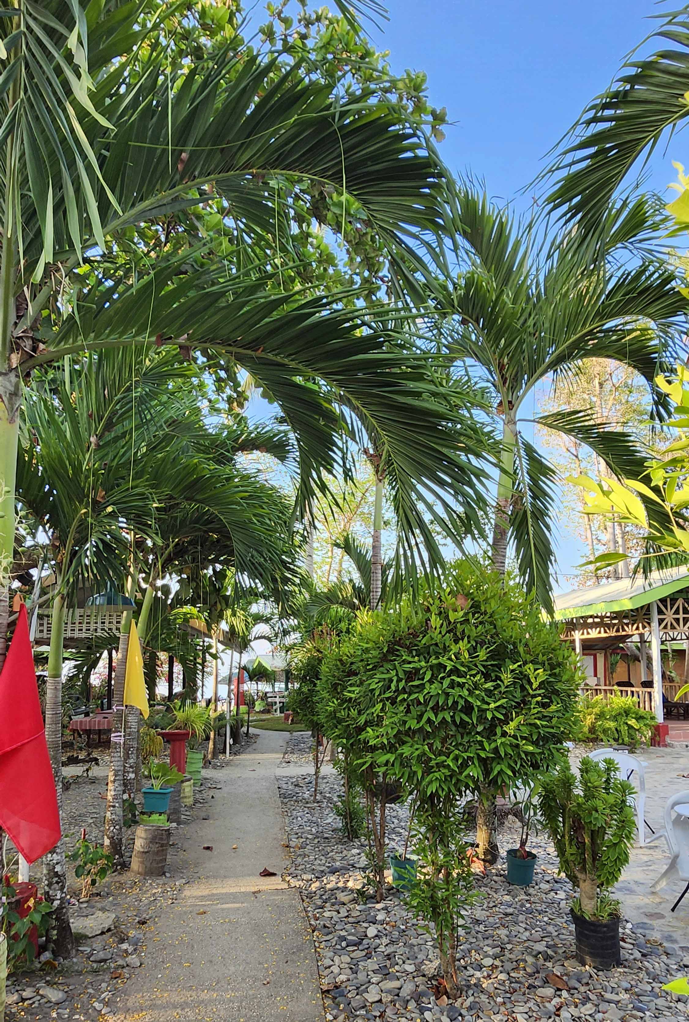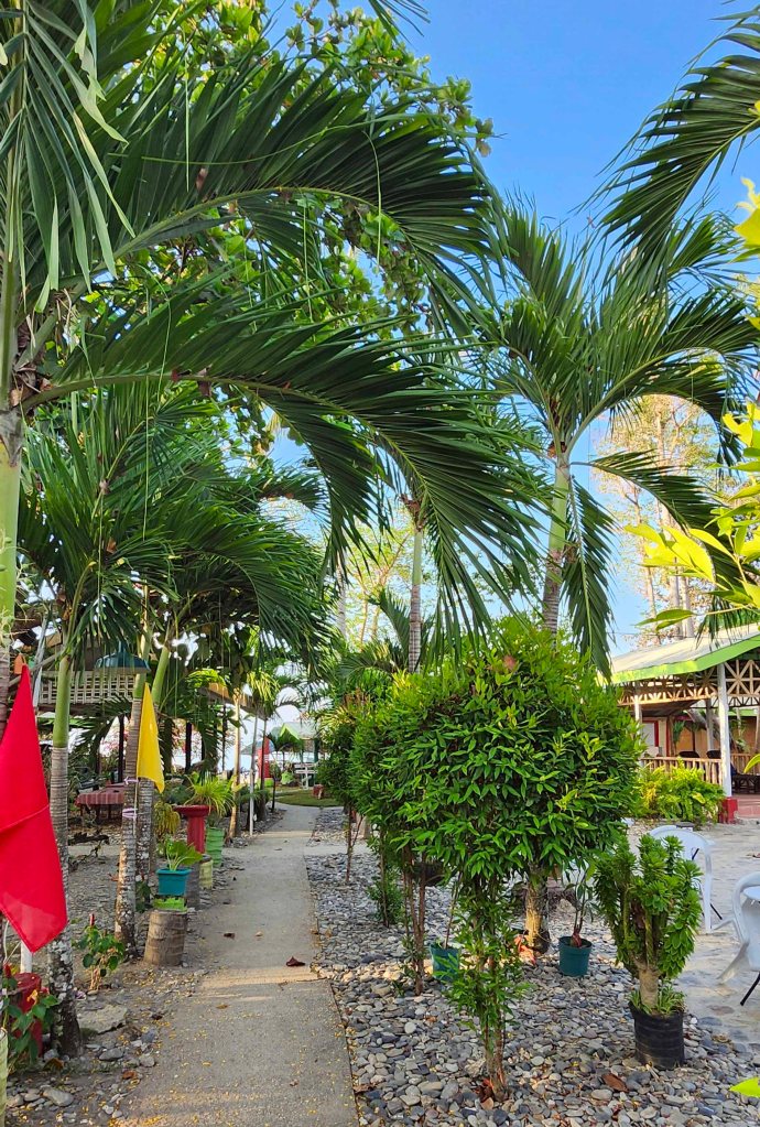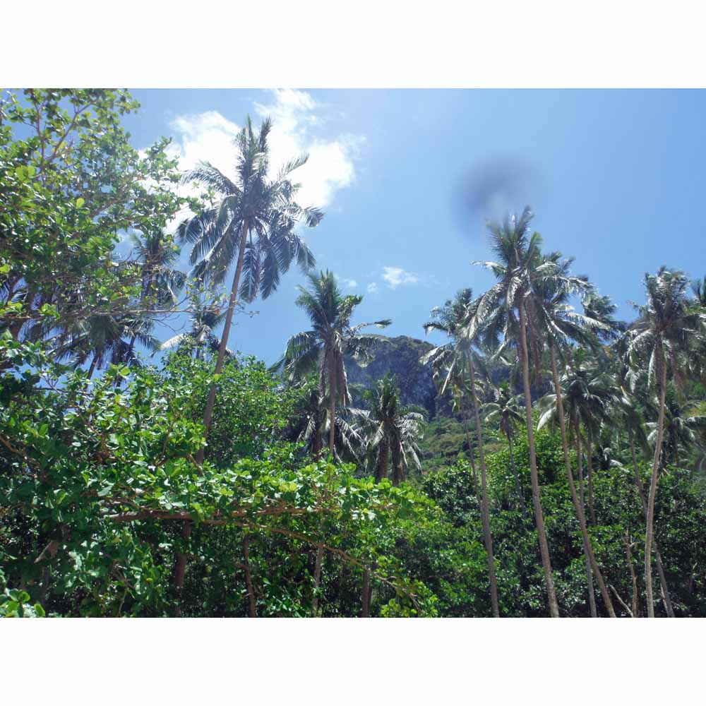 These islands have heavily eroded limestone faces – many very vertical. They are tree-covered. Passing through, you suddenly come across hidden “pocket beaches” lined with to-die-for palm trees. Some have openings to hidden lagoons behind. We stopped at one of these and kayaked into the lagoon. In there, the water was crystal clear and warm.