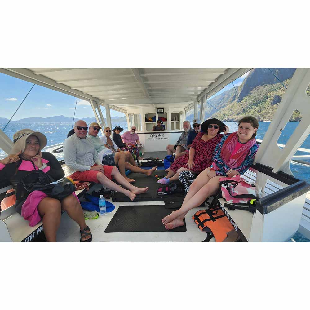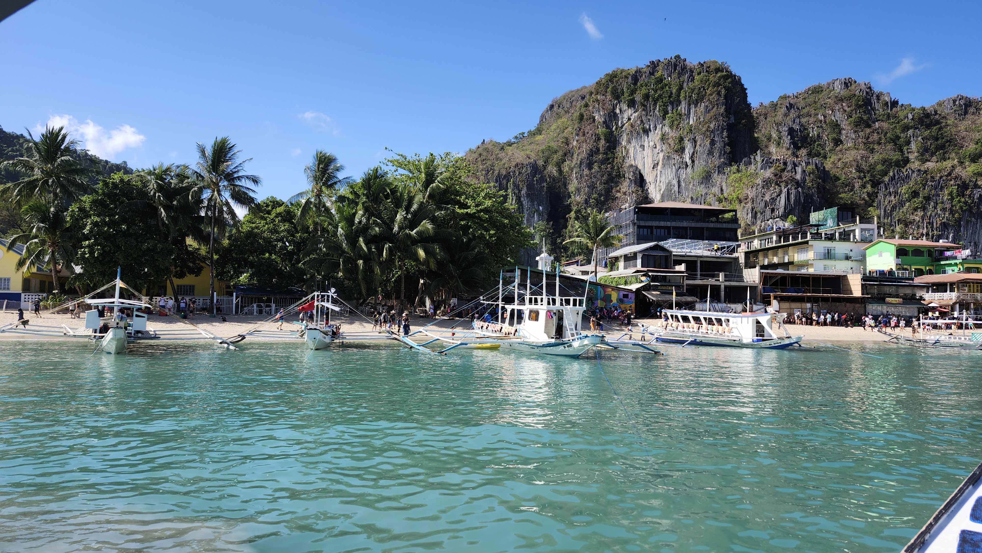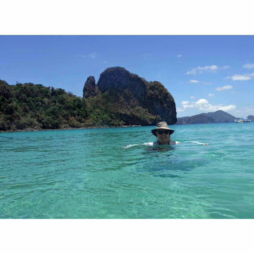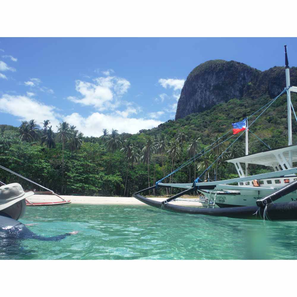 El Nido‘s Bacuit Archipelago is full of mysterious, vertically cliffed limestone islands – much like Vietnam’s Halong Bay. The similarity stops there. Here, it’s not only more beautiful, but there is so much more to do! And it’s much less polluted. At Halong Bay, hundreds of smoke-belching multi-level hotel-ships take tourists out for views, a meal and an overnight. But other than look at the islands, there isn’t much else to do. There are one or two beaches and hikes, and some paddling. The Bacuit Archipelago has the same islands, but they have hidden white sand beaches, palm treed islands, crystal clear lagoons, darn good snorkeling, and some world class blue green water for swimming! There are no cruise ships here. Outrigger boats head out from El Nido town early in the morning and take guests on tours to the islands. A full day includes a seafood lunch.