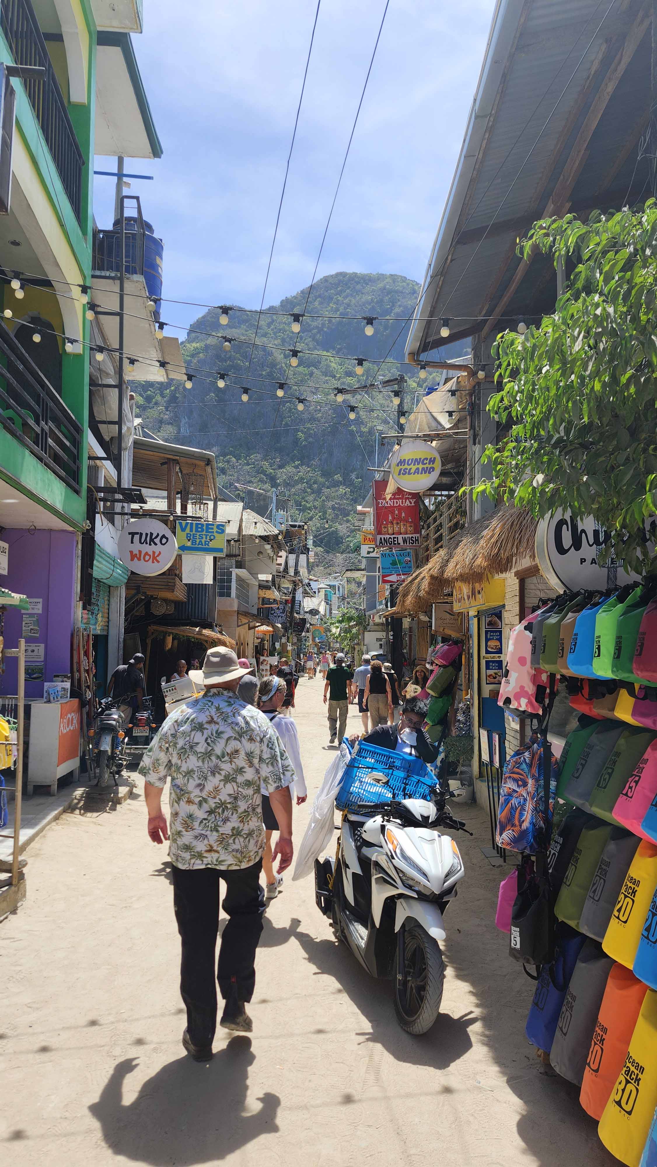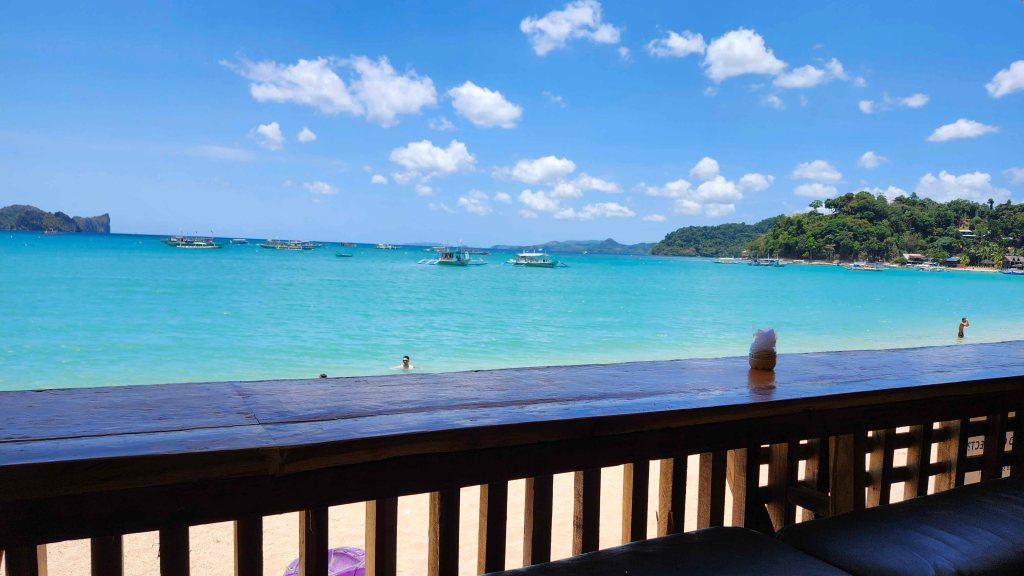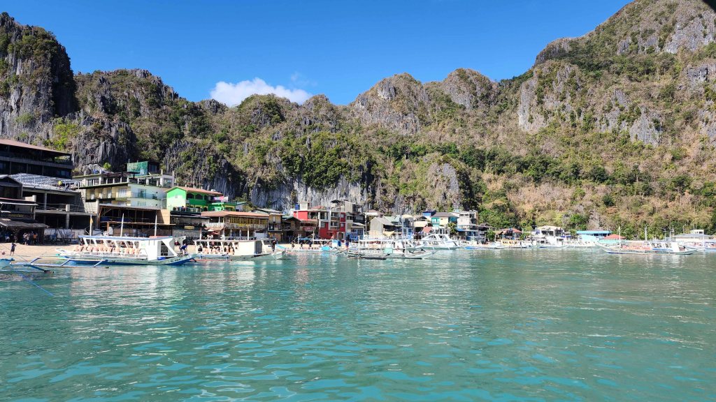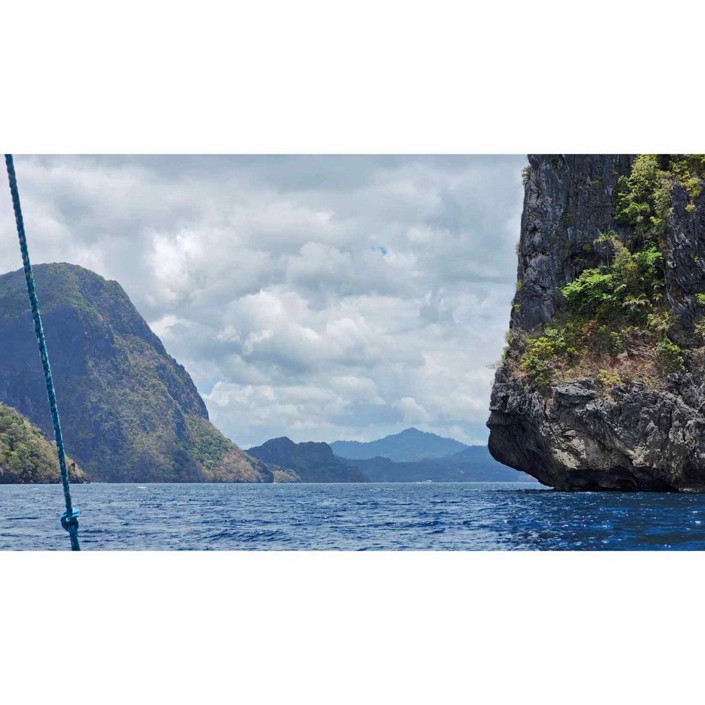 El Nido‘s Bacuit Archipelago is full of mysterious, vertically cliffed limestone islands – much like Vietnam’s Halong Bay. The similarity stops there. Here, it’s not only more beautiful, but there is so much more to do! And it’s much less polluted. At Halong Bay, hundreds of smoke-belching multi-level hotel-ships take tourists out for views, a meal and an overnight. But other than look at the islands, there isn’t much else to do. There are one or two beaches and hikes, and some paddling. The Bacuit Archipelago has the same islands, but they have hidden white sand beaches, palm treed islands, crystal clear lagoons, darn good snorkeling, and some world class blue green water for swimming! There are no cruise ships here. Outrigger boats head out from El Nido town early in the morning and take guests on tours to the islands. A full day includes a seafood lunch.