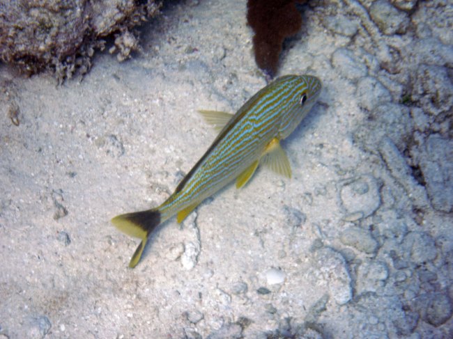 Some of the most common fish on the reef are grunts. There are different variants, but a frequently seen grunt is the Blue-Striped Grunt.