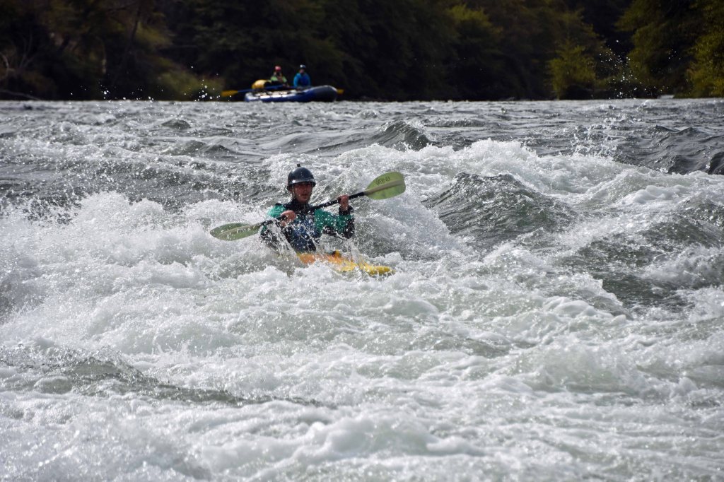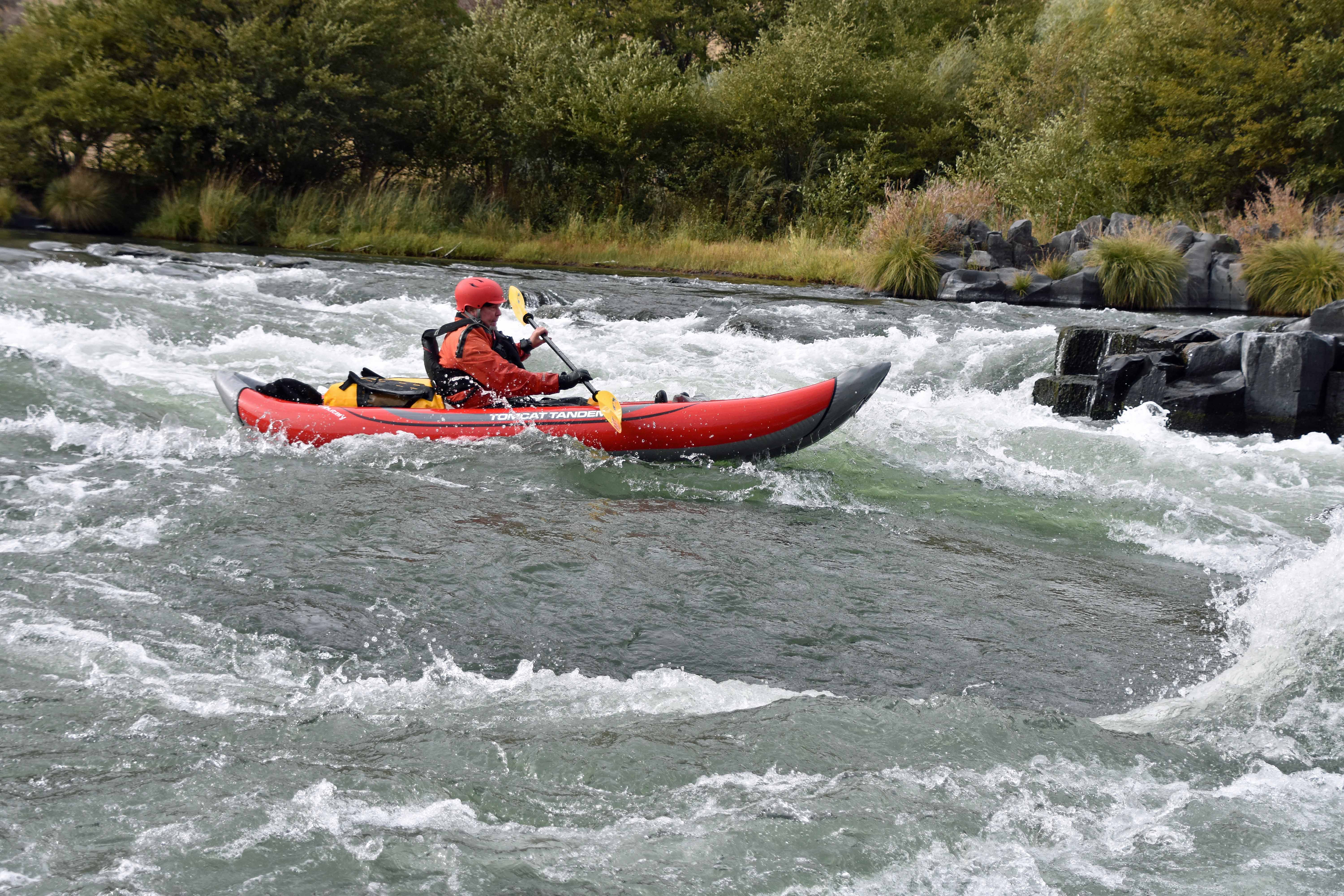 Off we went! This river section has a couple of Class II and a Class III (sometimes III+) rapid called Wreck Rapid. Turns out the name Wreck Rapid wasn’t referring to wrecking boats. It was the site of a 1949 railroad crash! As it’d been 10 years since I last whitewater boated, I chose an inflatable kayak. It was an Aire Tomcat. Inflatable whitewater kayaks are kind of two-faced. On the one hand, they are very forgiving, pretty much riding over eddies and opposing currents, rather than being thrown around by them. On the other hand, trying to make any sort of quick move just doesn’t happen. They are barge-like. I found the best way to approach a rapid or wave train is to just point it right at the waves and go. The main thing to avoid is being sideways to a wave. What is amazing is how fast they drain! Many times the kayak would seem to completely swamped, only to drain instantly. I brought along my bomber waterproof duffel by Ortlieb. It’d taken me on the Cordillera Huayhuash Trek in Peru, and the Annapurna Sanctuary Trek, in Nepal. But it hadn’t been subjected to constant thrashing on a river trip! This tough as nails bag came though completely dry on the inside. My drysuit, however, was as problematic as I’d feared. The right leg was very damp and foot wet. Yes, after the trip, on inspection, it had some kind of abrasion inside the leg, it had delamination, and the icing on the cake, a hole in the sock.