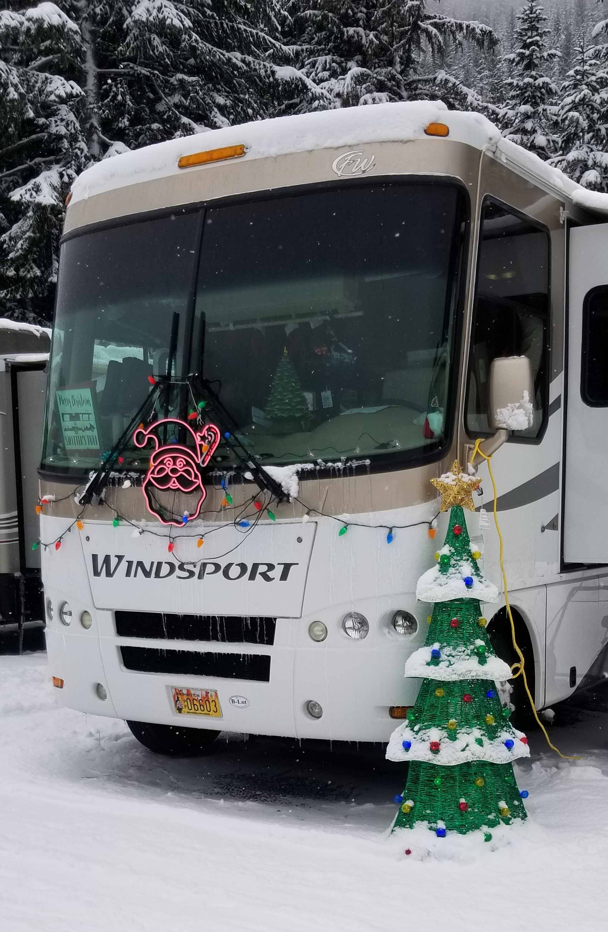 After all the excitement I reached Lot B. As it’s in a narrow valley, parking lots are stretched out along the bottom. Numerous shuttles ferry guests back and froth from the base to the lots. Quite a number of RVs overnighted. Some dressed for the holidays!