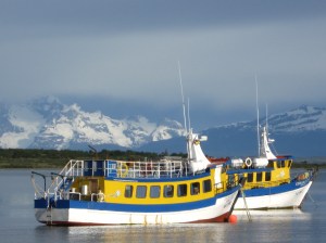 Looking out from Puerto Natales, glacier-cloaked mountains jump right from the water. A NaviMag ferry is tied up at the waterfront. These ferries ply these fjords. It is several days ferry ride from Puerto Montt to here. Take a gander at the Navimag website to see the incredible journeys.