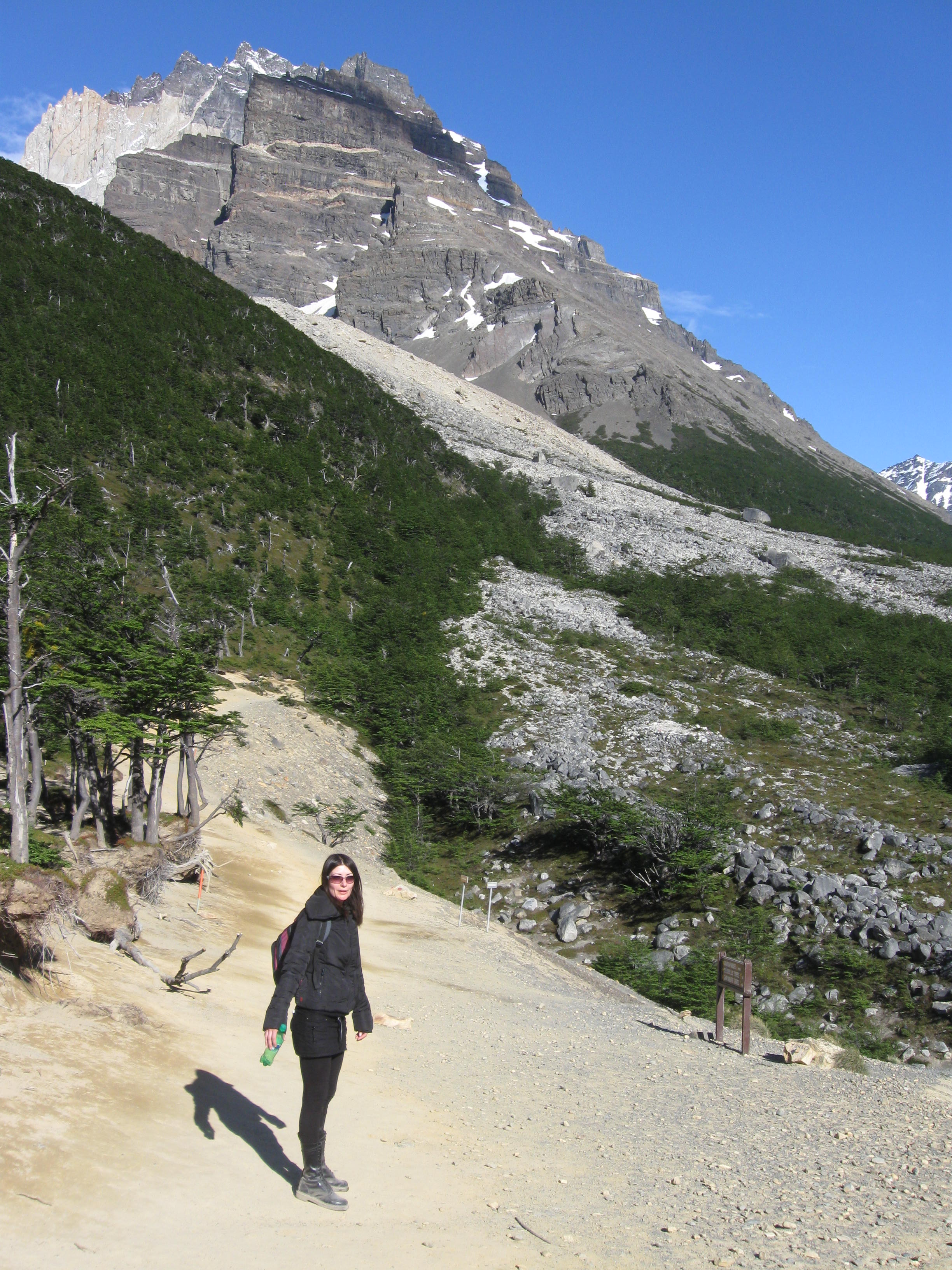 The trail winds through a boulder field, and the Torres Del Paine towers begin to come into full view.