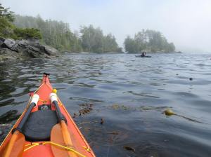 Having lost our gray whale we make our way across Coaster Channel to Camblain Island, then Cooper, behind Gilbert and finally Effingham Island. It’s only one nautical mile across Coaster Channel. Conditions are benign. A mild swell coming off the Pacific. Halfway across I hear a pfffuuuufff! And looking to my right I see a whale spout – and another! It’s two whales moving across the channel – now they’re over on the ocean side of Cooper and they’re moving inward. They are going to pass in front of us. We speed up but cannot catch them. Although they appear to be lumbering they are moving along fast. Judging from the tails I know these are Humpback Whales. It’s a mother and its calf! Like the gray whale, they move off until we can’t see where they are anymore.